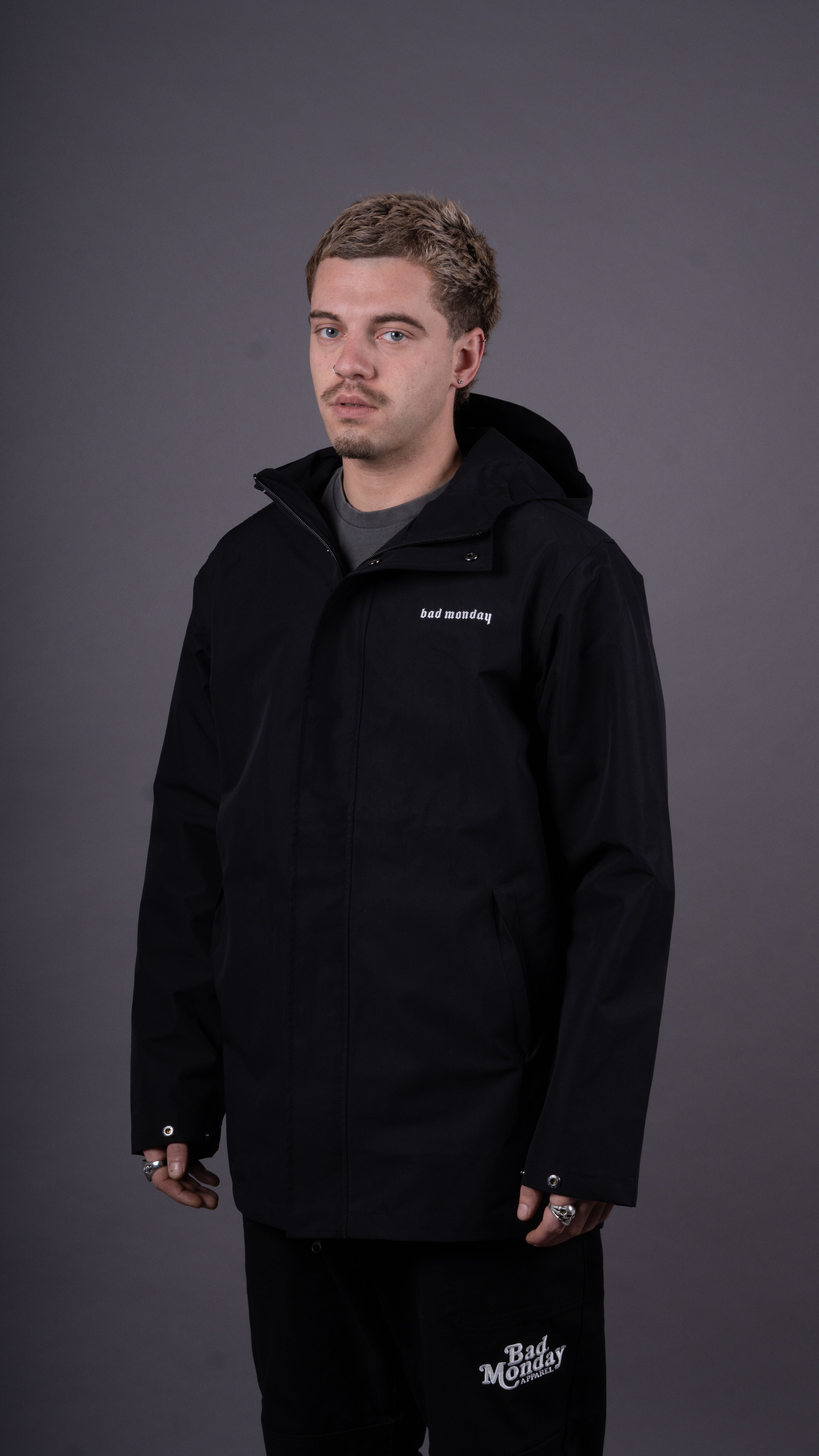 Seam sealed, waterproof zips, dome closure at CF and sleeve cuffs, yoke vent, internal cinch cord at hood, front pockets with welt covers.